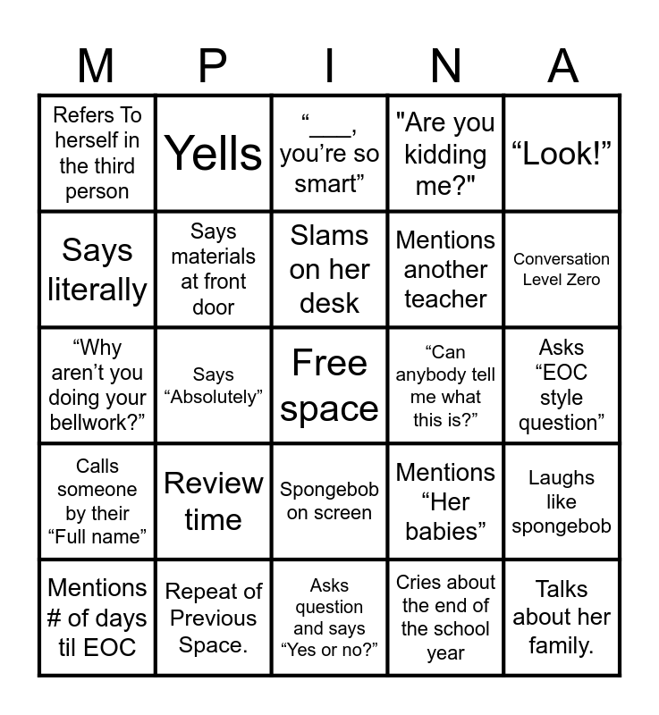 This bingo card has a free space and 34 words: Says something completely unrelated, Cries about the end of the school year, “Aye”, Freezes mid-sentence to call out a student, Calls someone by their “Full name”, Says materials at front door, “Look!”, Mentions # of days til EOC, Yells, “Very Demure, Very Cutsey”, Slams on her desk, “___, you’re so smart”, GIF on screen, “Didn’t They teach you this in 6/7th grade?”, “Can anybody tell me what this is?”, Conversation Level Zero, Repeat of Previous Space., “Why aren’t you doing your bellwork?”, Review time, Mentions “Her babies”, Spongebob on screen, Turns on GoGaurdian, Refers To herself in the third person, Asks “EOC style question”, Asks question and says “Yes or no?”, Talks about her family., "Are you kidding me?", Calendar on screen, Mentions another teacher, Says literally, Asks if we’re “Super ready?”, Says “Absolutely”, Laughs like spongebob and Randomly says “Are you ready?”.