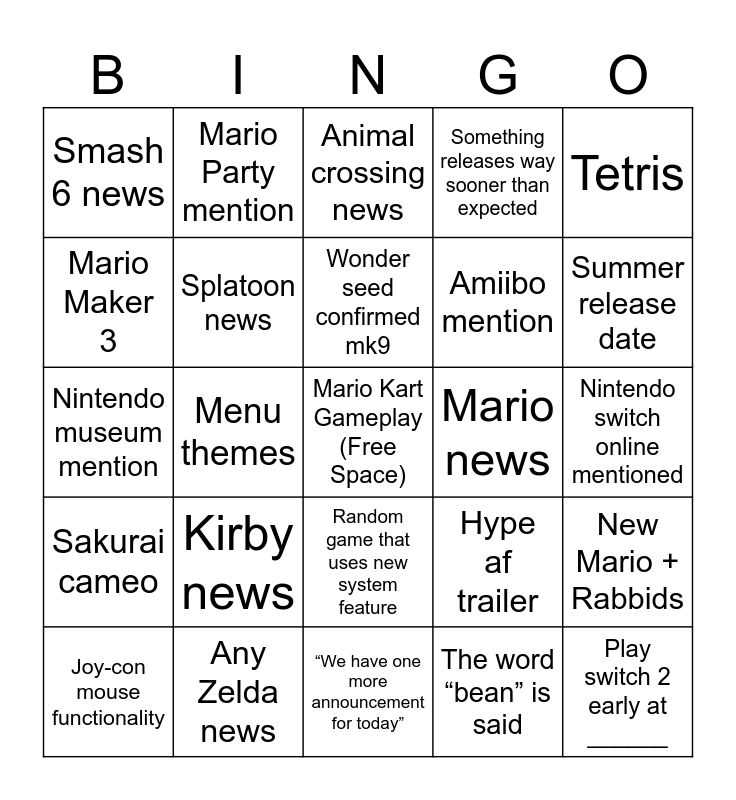 This bingo card has a free space and 29 words: Joy-con mouse functionality, Anti-drift functionality, Menu themes, New button, Smash 6 news, Animal crossing news, Splatoon news, Kirby news, Mario news, Any Zelda news, Nintendo switch online mentioned, Play switch 2 early at ______, “We have one more announcement for today”, The word “bean” is said, Summer release date, 3DS/WiiU gamepad emulation, Random game that uses new system feature, Sakurai cameo, Tetris, Nintendo museum mention, Hype af trailer, Miiverse rebirth, Amiibo mention, Mario Maker 3, Something releases way sooner than expected, Mario Party mention, New Mario + Rabbids, Wonder seed confirmed mk9 and Mario kart 9 roster.