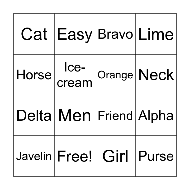 This bingo card has 16 words: Free!, Alpha, Bravo, Cat, Delta, Easy, Friend, Girl, Horse, Ice-cream, Javelin, Lime, Men, Neck, Orange and Purse.