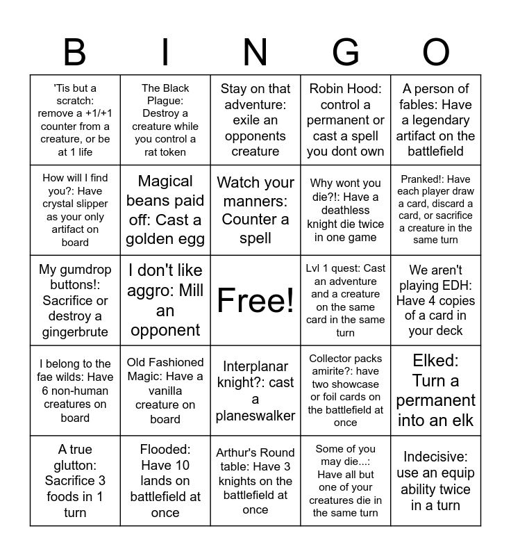 This bingo card has a free space and 25 words: Old Fashioned Magic: Have a vanilla creature on board, Arthur's Round table: Have 3 knights on the battlefield at once, Watch your manners: Counter a spell, A true glutton: Sacrifice 3 foods in 1 turn, A person of fables: Have a legendary artifact on the battlefield, 'Tis but a scratch: remove a +1/+1 counter from a creature, or be at 1 life, How will I find you?: Have crystal slipper as your only artifact on board, The Black Plague: Destroy a creature while you control a rat token, Lvl 1 quest: Cast an adventure and a creature on the same card in the same turn, Interplanar knight?: cast a planeswalker, Why wont you die?!: Have a deathless knight die twice in one game, My gumdrop buttons!: Sacrifice or destroy a gingerbrute, Collector packs amirite?: have two showcase or foil cards on the battlefield at once, Elked: Turn a permanent into an elk, Magical beans paid off: Cast a golden egg, Perfect Mana: cast a 4 hybrid-costed card with mana from at least 4 of the same basic land, We aren't playing EDH: Have 4 copies of a card in your deck, Stay on that adventure: exile an opponents creature, Pranked!: Have each player draw a card, discard a card, or sacrifice a creature in the same turn, I don't like aggro: Mill an opponent, Indecisive: use an equip ability twice in a turn, Flooded: Have 10 lands on battlefield at once, I belong to the fae wilds: Have 6 non-human creatures on board, Robin Hood: control a permanent or cast a spell you dont own and Some of you may die...: Have all but one of your creatures die in the same turn.