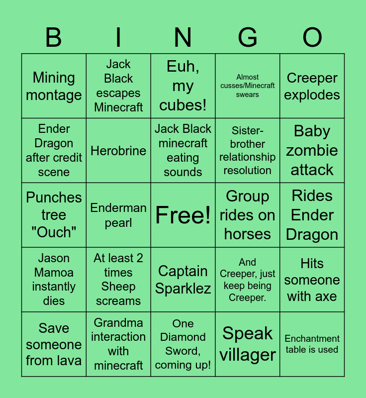 This bingo card has a free space and 24 words: At least 2 times Sheep screams, Grandma interaction with minecraft, Jack Black minecraft eating sounds, Save someone from lava, Creeper explodes, Mining montage, Ender Dragon after credit scene, Jack Black escapes Minecraft, Group rides on horses, Captain Sparklez, Sister-brother relationship resolution, Punches tree "Ouch", And Creeper, just keep being Creeper., Hits someone with axe, Herobrine, Speak villager, Rides Ender Dragon, Euh, my cubes!, Baby zombie attack, Enderman pearl, Enchantment table is used, Jason Mamoa instantly dies, Almost cusses/Minecraft swears and One Diamond Sword, coming up!.