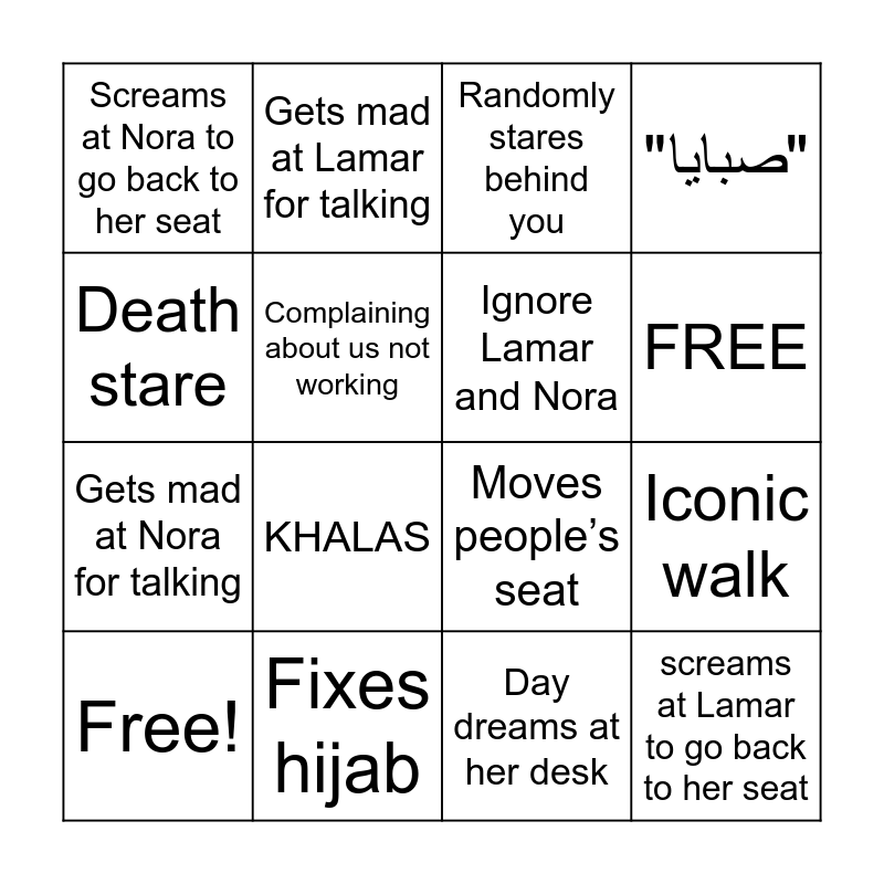This bingo card has 16 words: Free!, Fixes hijab, Randomly stares behind you, "صبايا", Death stare, Gets mad at Lamar for talking, Moves people’s seat, Iconic walk, Screams at Nora to go back to her seat, Complaining about us not working, Day dreams at her desk, FREE, Gets mad at Nora for talking, KHALAS, Ignore Lamar and Nora and screams at Lamar to go back to her seat.