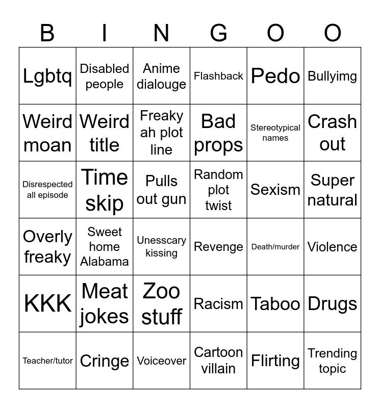 This bingo card has 36 words: Racism, Zoo stuff, Cartoon villain, Weird moan, Overly freaky, Random plot twist, Weird title, Voiceover, Pedo, Taboo, Crash out, Flashback, Drugs, Time skip, Bad props, Lgbtq, KKK, Sexism, Disrespected all episode, Anime dialouge, Pulls out gun, Sweet home Alabama, Revenge, Unesscary kissing, Death/murder, Disabled people, Stereotypical names, Cringe, Freaky ah plot line, Bullyimg, Trending topic, Teacher/tutor, Violence, Super natural, Meat jokes and Flirting.