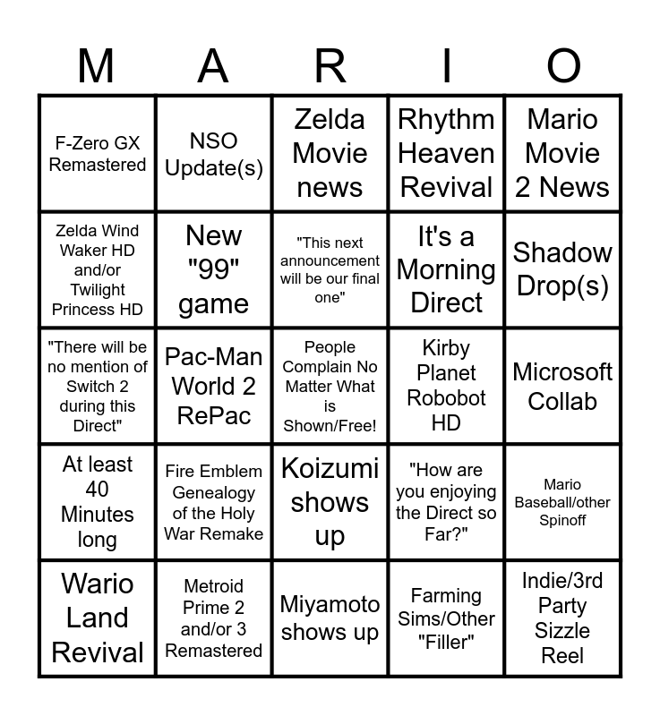 This bingo card has a free space and 24 words: Fire Emblem Genealogy of the Holy War Remake, Metroid Prime 2 and/or 3 Remastered, "This next announcement will be our final one", Wario Land Revival, Mario Movie 2 News, F-Zero GX Remastered, Zelda Wind Waker HD and/or Twilight Princess HD, NSO Update(s), Kirby Planet Robobot HD, Koizumi shows up, It's a Morning Direct, "There will be no mention of Switch 2 during this Direct", "How are you enjoying the Direct so Far?", Mario Baseball/other Spinoff, New "99" game, Farming Sims/Other "Filler", Microsoft Collab, Zelda Movie news, Shadow Drop(s), Pac-Man World 2 RePac, Indie/3rd Party Sizzle Reel, At least 40 Minutes long, Rhythm Heaven Revival and Miyamoto shows up.