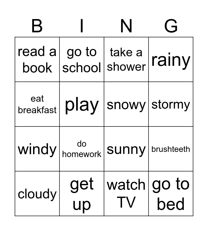 This bingo card has 16 words: cloudy, get up, take a shower, rainy, eat breakfast, go to school, sunny, brushteeth, read a book, play, watch TV, stormy, windy, do homework, snowy and go to bed.