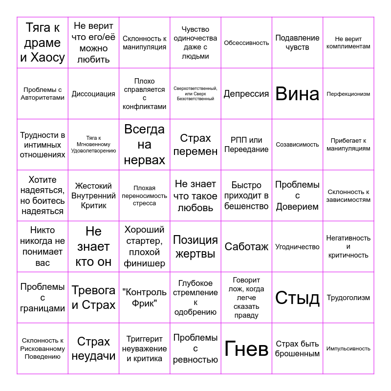 This bingo card has 49 words: Стыд, Вина, Гнев, Жестокий Внутренний Критик, Всегда на нервах, Склонность к зависимостям, Не верит что его/её можно любить, Триггерит неуважение и критика, Подавление чувств, Позиция жертвы, Не верит комплиментам, Чувство одиночества даже с людьми, Созависимость, РПП или Переедание, Тревога и Страх, Проблемы с Доверием, Проблемы с Авторитетами, Перфекционизм, Трудоголизм, Обсессивность, Депрессия, Плохая переносимость стресса, Тяга к драме и Хаосу, Диссоциация, Склонность к Рискованному Поведению, Плохо справляется с конфликтами, Прибегает к манипуляциям, Страх неудачи, Страх перемен, Тяга к Мгновенному Удоволетворению, Импульсивность, Быстро приходит в бешенство, Проблемы с границами, "Контроль Фрик", Хотите надеяться, но боитесь надеяться, Саботаж, Угодничество, Негативность и критичность, Трудности в интимных отношениях, Хороший стартер, плохой финишер, Глубокое стремление к одобрению, Никто никогда не понимает вас, Не знает что такое любовь, Проблемы с ревностью, Сверхответственный, или Сверх Безответственный, Склонность к манипуляция, Говорит лож, когда легче сказать правду, Не знает кто он and Страх быть брошенным.