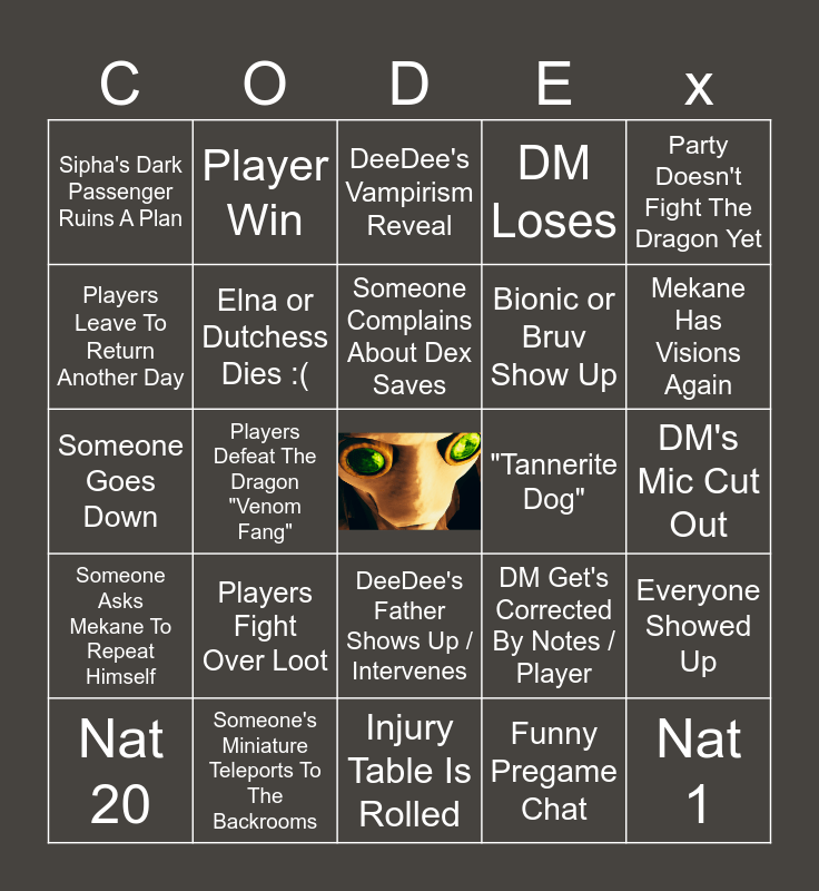 This bingo card has a free space and 24 words: Nat 20, Players Fight Over Loot, Someone Complains About Dex Saves, Funny Pregame Chat, Party Doesn't Fight The Dragon Yet, Sipha's Dark Passenger Ruins A Plan, Player Win, DeeDee's Vampirism Reveal, "Tannerite Dog", DM's Mic Cut Out, Someone Goes Down, Elna or Dutchess Dies :(, DM Get's Corrected By Notes / Player, Everyone Showed Up, Players Leave To Return Another Day, Someone's Miniature Teleports To The Backrooms, Injury Table Is Rolled, DM Loses, Mekane Has Visions Again, Someone Asks Mekane To Repeat Himself, Players Defeat The Dragon "Venom Fang", DeeDee's Father Shows Up / Intervenes, Bionic or Bruv Show Up and Nat 1.