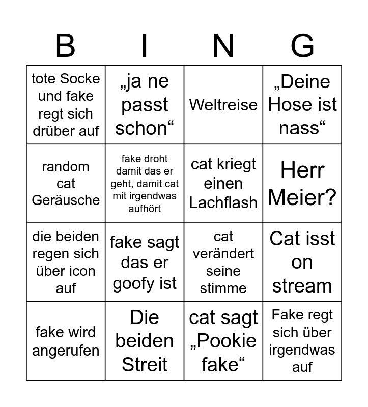 This bingo card has 16 words: Die beiden Streit, Cat isst on stream, Weltreise, tote Socke und fake regt sich drüber auf, die beiden regen sich über icon auf, „ja ne passt schon“, cat verändert seine stimme, cat sagt „Pookie fake“, random cat Geräusche, fake droht damit das er geht, damit cat mit irgendwas aufhört, fake wird angerufen, „Deine Hose ist nass“, fake sagt das er goofy ist, Herr Meier?, cat kriegt einen Lachflash and Fake regt sich über irgendwas auf.