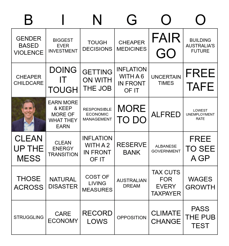 This bingo card has 2 images and 44 words: A REAL PLAN, ALBANESE GOVERNMENT, ALFRED, AUSTRALIAN DREAM, BIGGEST EVER INVESTMENT, BUDGET REPAIR, BUILDING AUSTRALIA'S FUTURE, CARE ECONOMY, CHEAPER CHILDCARE, CHEAPER MEDICINES, CLEAN ENERGY TRANSITION, CLEAN UP THE MESS, CLIMATE CHANGE, COST OF LIVING MEASURES, DOING IT TOUGH, EARN MORE & KEEP MORE OF WHAT THEY EARN, ENERGY BILL RELIEF, FAIR GO, FREE TAFE, FREE TO SEE A GP, GENDER BASED VIOLENCE, GETTING ON WITH THE JOB, HAVE YOUR BACK, INFLATION WITH A 6 IN FRONT OF IT, INFLATION WITH A 2 IN FRONT OF IT, LIBERAL DEBT, LOWEST UNEMPLOYMENT RATE, MORE TO DO, MR. SPEAKER, NATURAL DISASTER, OPPOSITION, PASS THE PUB TEST, RECORD LOWS, RESERVE BANK, RESPONSIBLE ECONOMIC MANAGEMENT, STRUGGLING, SURPLUS, TAX CUTS FOR EVERY TAXPAYER, THOSE ACROSS, TOUGH DECISIONS, UNCERTAIN TIMES, URGENT CARE CLINICS, WAGES GROWTH and WORK LONGER FOR LESS.