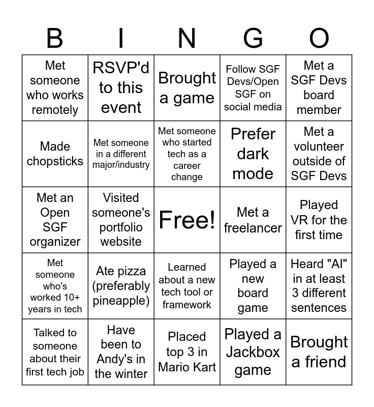 This bingo card has a free space and 24 words: Ate pizza (preferably pineapple), Have been to Andy's in the winter, Met someone who started tech as a career change, Talked to someone about their first tech job, Met a SGF Devs board member, Met someone who works remotely, Made chopsticks, RSVP'd to this event, Met a freelancer, Learned about a new tech tool or framework, Prefer dark mode, Met an Open SGF organizer, Played a new board game, Heard "AI" in at least 3 different sentences, Met someone in a different major/industry, Played a Jackbox game, Played VR for the first time, Brought a game, Met a volunteer outside of SGF Devs, Visited someone's portfolio website, Brought a friend, Met someone who's worked 10+ years in tech, Follow SGF Devs/Open SGF on social media and Placed top 3 in Mario Kart.