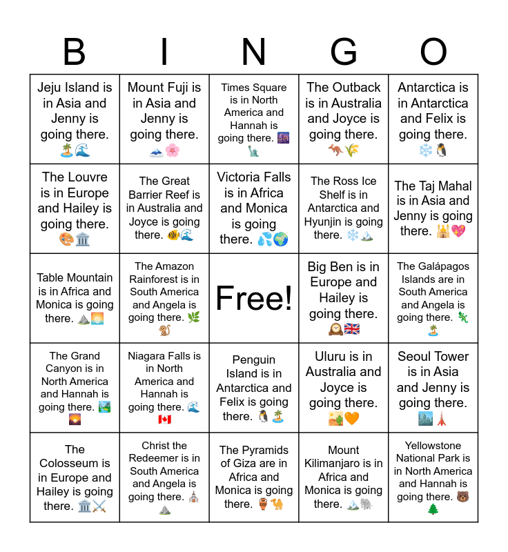 This bingo card has a free space and 33 words: The Eiffel Tower is in Europe and Hailey is going there. π«π·β¨, The Great Wall is in Asia and Jenny is going there. π―π, The Amazon Rainforest is in South America and Angela is going there. πΏπ, The Sahara Desert is in Africa and Monica is going there. ποΈπͺ, The Grand Canyon is in North America and Hannah is going there. ποΈπ, The Great Barrier Reef is in Australia and Joyce is going there. π π, Antarctica is in Antarctica and Felix is going there. βοΈπ§, The Colosseum is in Europe and Hailey is going there. ποΈβοΈ, Mount Fuji is in Asia and Jenny is going there. π»πΈ, Machu Picchu is in South America and Angela is going there. ποΈποΈ, Victoria Falls is in Africa and Monica is going there. π¦π, Times Square is in North America and Hannah is going there. ππ½, Sydney Opera House is in Australia and Joyce is going there. ππΆ, The South Pole is in Antarctica and Bang Chan is going there. βοΈβ, Big Ben is in Europe and Hailey is going there. π°οΈπ¬π§, The Taj Mahal is in Asia and Jenny is going there. ππ, Christ the Redeemer is in South America and Angela is going there. βͺβ°οΈ, Table Mountain is in Africa and Monica is going there. β°οΈπ , Niagara Falls is in North America and Hannah is going there. ππ¨π¦, Uluru is in Australia and Joyce is going there. ποΈπ§‘, Penguin Island is in Antarctica and Felix is going there. π§ποΈ, The Leaning Tower of Pisa is in Europe and Hailey is going there. ποΈπ², Jeju Island is in Asia and Jenny is going there. ποΈπ, The GalΓ‘pagos Islands are in South America and Angela is going there. π¦ποΈ, The Pyramids of Giza are in Africa and Monica is going there. πΊπͺ, Yellowstone National Park is in North America and Hannah is going there. π»π², The Outback is in Australia and Joyce is going there. π¦πΎ, The Ross Ice Shelf is in Antarctica and Hyunjin is going there. βοΈποΈ, The Louvre is in Europe and Hailey is going there. π¨ποΈ, Seoul Tower is in Asia and Jenny is going there. ποΈπΌ, The Amazon River is in South America and Angela is going there. π£ββοΈπΏ, Mount Kilimanjaro is in Africa and Monica is going there. ποΈπ and Hollywood is in North America and Hannah is going there. π¬π.