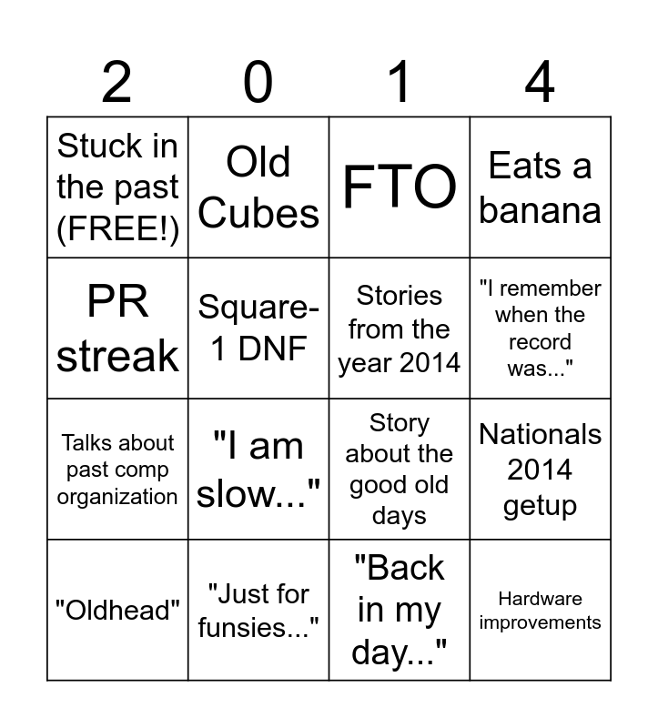 This bingo card has 16 words: "Oldhead", "Just for funsies...", FTO, Eats a banana, PR streak, Old Cubes, Story about the good old days, Nationals 2014 getup, Stuck in the past (FREE!), Square-1 DNF, "Back in my day...", "I remember when the record was...", Talks about past comp organization, "I am slow...", Stories from the year 2014 and Hardware improvements.