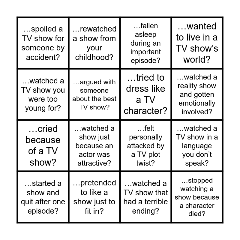 This bingo card has 20 words: …watched a TV show in a language you don’t speak?, …laughed so hard at a show that you had to pause it?, …fallen asleep during an important episode?, …watched an entire season in one day?, …started a show and quit after one episode?, …watched a TV show you were too young for?, …pretended to like a show just to fit in?, …spoiled a TV show for someone by accident?, …cried because of a TV show?, …rewatched a show from your childhood?, …watched a show just because an actor was attractive?, …felt personally attacked by a TV plot twist?, …argued with someone about the best TV show?, …stopped watching a show because a character died?, …tried to dress like a TV character?, …recommended a show that no one liked?, …watched a reality show and gotten emotionally involved?, …wanted to live in a TV show’s world?, …watched a TV show that had a terrible ending? and …been late to something because you were watching TV?.