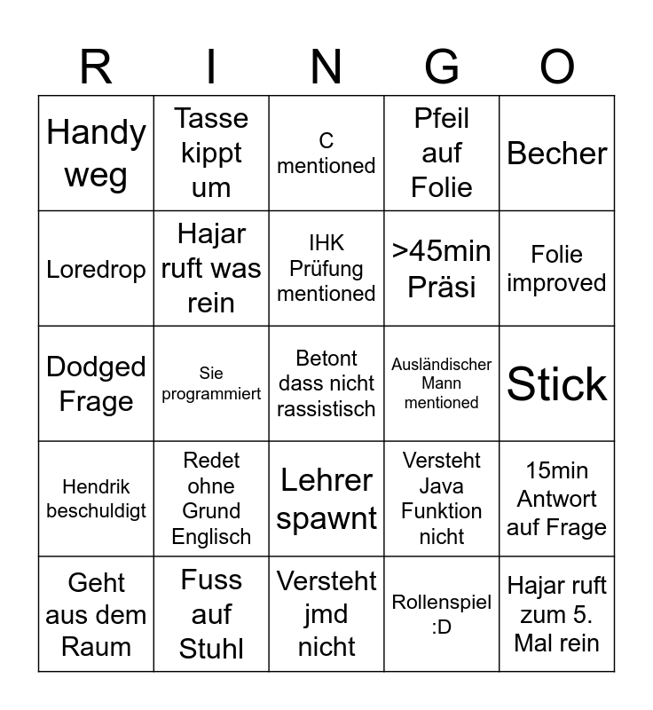 This bingo card has 25 words: Redet ohne Grund Englisch, Versteht jmd nicht, IHK Prüfung mentioned, Geht aus dem Raum, Becher, Handy weg, Loredrop, Tasse kippt um, Ausländischer Mann mentioned, Lehrer spawnt, >45min Präsi, Dodged Frage, Versteht Java Funktion nicht, 15min Antwort auf Frage, Hajar ruft was rein, Hajar ruft zum 5. Mal rein, Stick, C mentioned, Folie improved, Sie programmiert, Betont dass nicht rassistisch, Fuss auf Stuhl, Hendrik beschuldigt, Pfeil auf Folie and Rollenspiel :D.