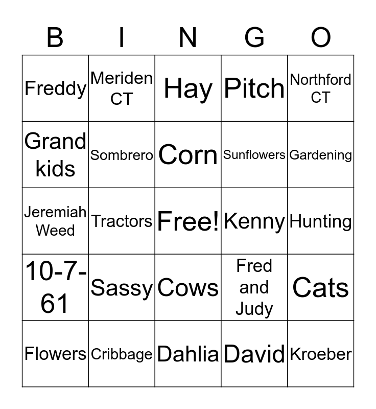 This bingo card has a free space and 24 words: Sassy, Cribbage, Corn, Flowers, Northford CT, Freddy, Grand kids, Meriden CT, Kenny, Cows, Sunflowers, Jeremiah Weed, Fred and Judy, Cats, Sombrero, David, Hunting, Hay, Gardening, Tractors, Kroeber, 10-7-61, Pitch and Dahlia.