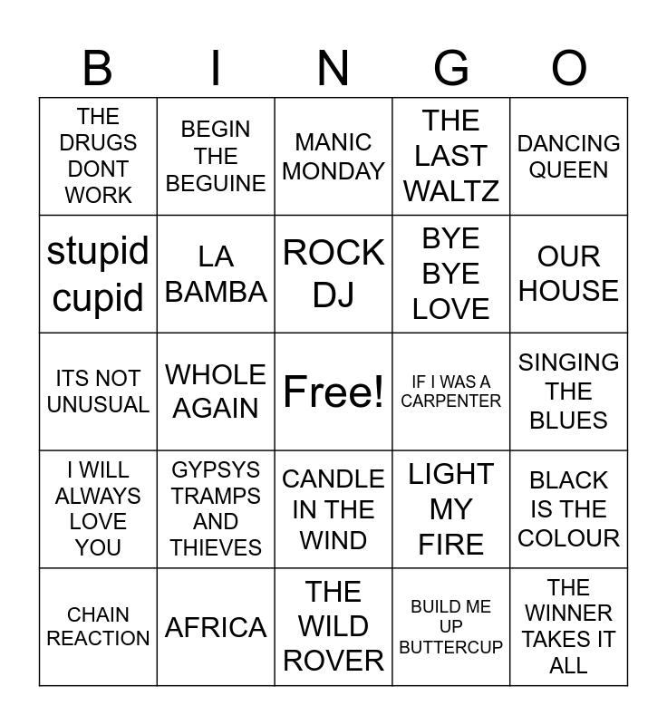 This bingo card has a free space and 43 words: A LITTLE BIT MORE, THE WINNER TAKES IT ALL, TAKE A CHANCE ON ME, CHAIN REACTION, PRETTY WOMAN, BUILD ME UP BUTTERCUP, MANIC MONDAY, YOU SEXY THING, DANCING QUEEN, AFRICA, THE LAST WALTZ, IF I WAS A CARPENTER, CANDLE IN THE WIND, GYPSYS TRAMPS AND THIEVES, ROCKET MAN, THE WILD ROVER, 8 DAYS A WEEK, ITS NOT UNUSUAL, CANT BUY ME LOVE, OUR HOUSE, BEGIN THE BEGUINE, PRETTY BROWN EYES, ITS MY PARTY, THE DRUGS DONT WORK, ACHY BREAKY HEART, SINGING THE BLUES, COWARD OF THE COUNTY, KATE DALY, LIGHT MY FIRE, I WILL ALWAYS LOVE YOU, THE CLIFFS OF DOONEEN, BLACK IS THE COLOUR, MY SWEET LORD, WHOLE AGAIN, LEAVING ON A JET PLANE, ANNIES SONG, COUNTRY ROADS, ROCK DJ, stupid cupid, BYE BYE LOVE, UNDER THE BOARDWALK, LA BAMBA and IM INTO SOMETHING GOOD.