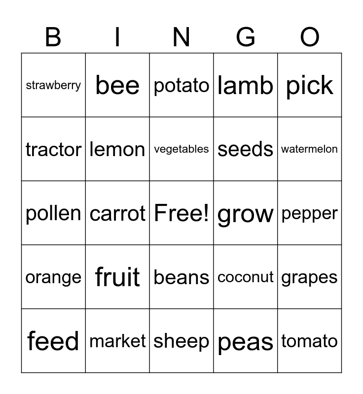 This bingo card has a free space and 24 words: fruit, market, vegetables, feed, pick, strawberry, tractor, bee, grow, beans, seeds, pollen, coconut, grapes, lemon, peas, pepper, potato, watermelon, carrot, tomato, orange, lamb and sheep.