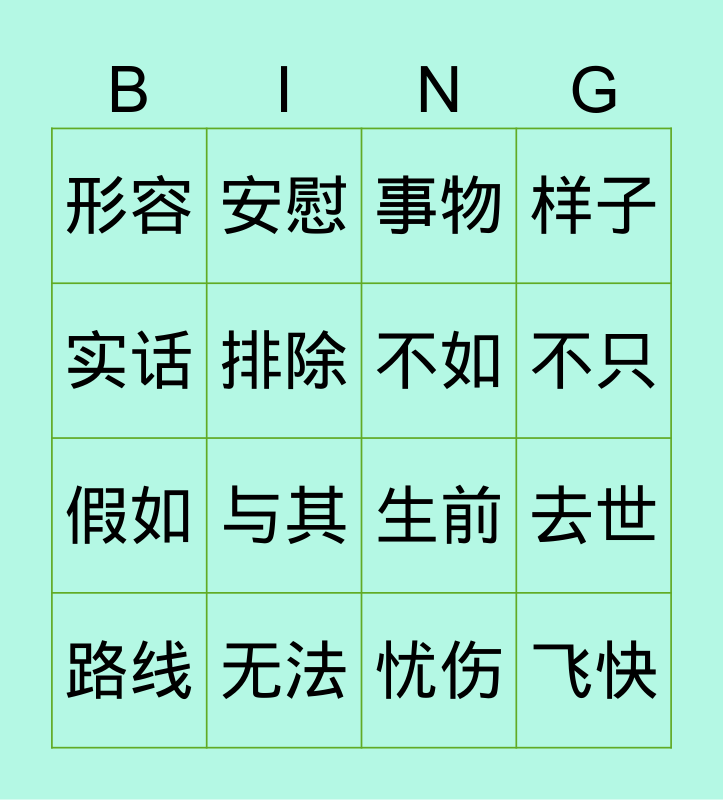 This bingo card has 16 words: 无法, 去世, 事物, 形容, 假如, 安慰, 生前, 忧伤, 实话, 排除, 路线, 样子, 与其, 不只, 不如 and 飞快.