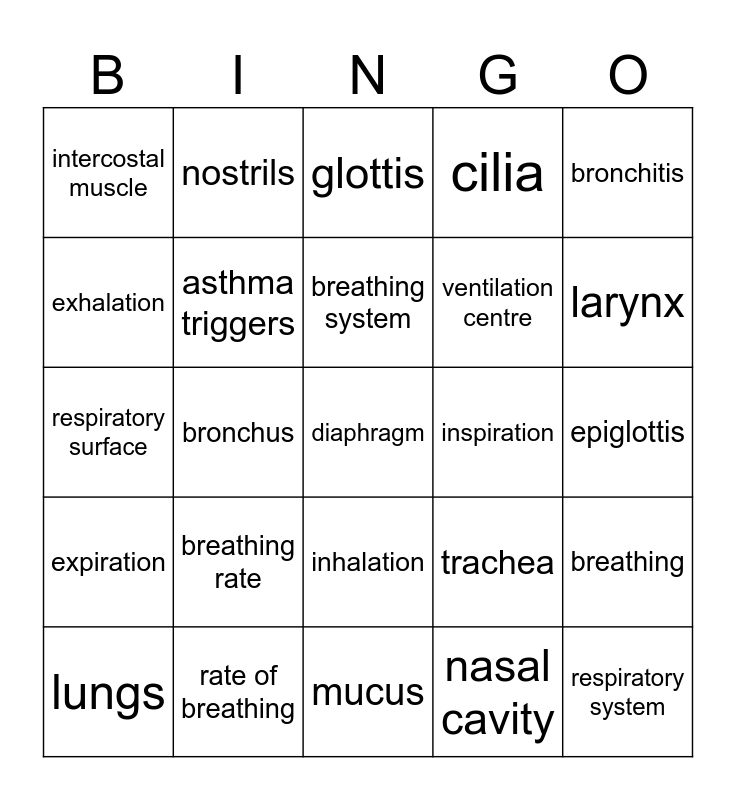 This bingo card has 37 words: Free!, alveoli, asthma, asthma triggers, breathing, breathing rate, breathing system, bronchiole, bronchitis, bronchodilator, bronchus, cilia, diaphragm, epiglottis, exhalation, expiration, gaseous exchange, glottis, inhalation, inspiration, intercostal muscle, larynx, lungs, mucus, nasal, nasal cavity, nostrils, oxygenated blood, pleural cavity, pleural fluid, pleural membranes, rate of breathing, respiratory surface, respiratory system, trachea, ventilation centre and vocal cords.