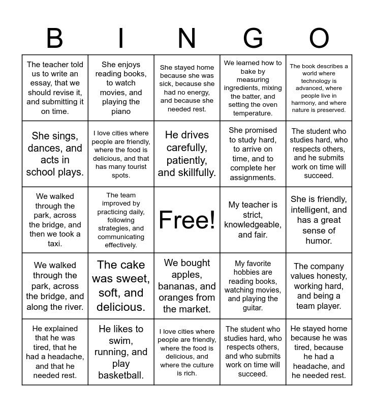 This bingo card has a free space and 24 words: The cake was sweet, soft, and delicious., He likes to swim, running, and play basketball., He drives carefully, patiently, and skillfully., He explained that he was tired, that he had a headache, and that he needed rest., The book describes a world where technology is advanced, where people live in harmony, and where nature is preserved., The teacher told us to write an essay, that we should revise it, and submitting it on time., She sings, dances, and acts in school plays., She enjoys reading books, to watch movies, and playing the piano, My teacher is strict, knowledgeable, and fair., We bought apples, bananas, and oranges from the market., She promised to study hard, to arrive on time, and to complete her assignments., We walked through the park, across the bridge, and then we took a taxi., My favorite hobbies are reading books, watching movies, and playing the guitar., The company values honesty, working hard, and being a team player., I love cities where people are friendly, where the food is delicious, and that has many tourist spots., The student who studies hard, who respects others, and who submits work on time will succeed., She is friendly, intelligent, and has a great sense of humor., She stayed home because she was sick, because she had no energy, and because she needed rest., The student who studies hard, who respects others, and he submits work on time will succeed., The team improved by practicing daily, following strategies, and communicating effectively., He stayed home because he was tired, because he had a headache, and he needed rest., We walked through the park, across the bridge, and along the river., We learned how to bake by measuring ingredients, mixing the batter, and setting the oven temperature. and I love cities where people are friendly, where the food is delicious, and where the culture is rich..