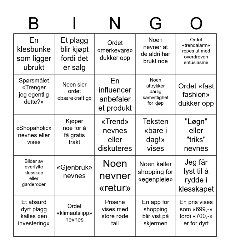 This bingo card has a free space and 28 words: Jeg får lyst til å rydde i klesskapet, «Limited edition» nevnes, Noen uttrykker dårlig samvittighet for kjøp, En app for shopping blir vist på skjermen, Spørsmålet «Trenger jeg egentlig dette?», Ordet «merkevare» dukker opp, Et plagg blir kjøpt fordi det er salg, Bilder av overfylte klesskap eller garderober, Teksten «bare i dag!» vises, Et absurd dyrt plagg kalles «en investering», «Shopaholic» nevnes eller vises, Noen nevner at de aldri har brukt noe, Ordet «klimautslipp» nevnes, Prisene vises med store røde tall, Ordet «fast fashion» dukker opp, Ordet «impulskjøp» blir nevnt, «Gjenbruk» nevnes, Noen sier ordet «bærekraftig», En influencer anbefaler et produkt, Noen nevner «retur», En klesbunke som ligger ubrukt, Klesplagg med lappen fortsatt på, En pris vises som «699,-» fordi «700,-» er for dyrt, Kjøper noe for å få gratis frakt, "Løgn" eller "triks" nevnes, Noen kaller shopping for «egenpleie», Ordet «trendalarm» ropes ut med overdreven entusiasme and En influencer hevder de «alltid har elsket» produktet de fikk i posten i går.