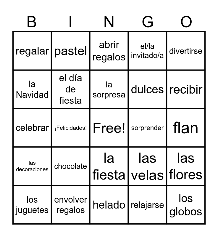 This bingo card has a free space and 35 words: el aniversario, la boda, el cumpleaños, el día de fiesta, la fiesta, el/la invitado/a, la Navidad, la quinceañera, la sorpresa, brindar, celebrar, divertirse, invitar, pasarlo bien/mal, regalar, sorprender, relajarse, ¡Felicidades!, las decoraciones, los globos, las velas, los juguetes, las flores, envolver regalos, abrir regalos, recibir, sonreír, reírse, dulces, flan, galleta, helado, chocolate, pastel and postre.