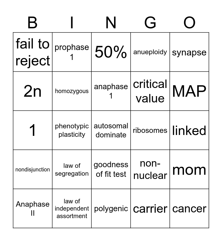 This bingo card has a free space and 24 words: law of segregation, law of independent assortment, anaphase 1, Anaphase II, synapse, fail to reject, 2n, prophase 1, ribosomes, goodness of fit test, critical value, 1, non-nuclear, mom, homozygous, carrier, linked, 50%, MAP, phenotypic plasticity, cancer, nondisjunction, anueploidy and polygenic.