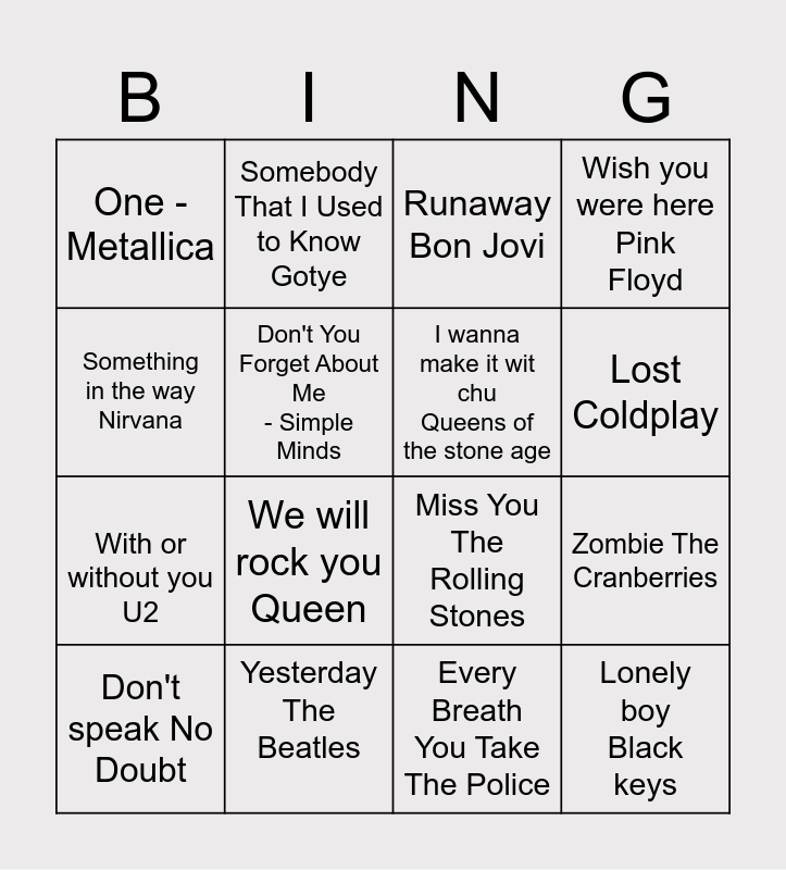 This bingo card has 16 words: Don't speak No Doubt, Yesterday The Beatles, Runaway Bon Jovi, Wish you were here Pink Floyd, Something in the way Nirvana, Somebody That I Used to Know Gotye, Miss You The Rolling Stones, Zombie The Cranberries, One - Metallica, Don't You Forget About Me - Simple Minds, Every Breath You Take The Police, Lost Coldplay, With or without you U2, We will rock you Queen, I wanna make it wit chu Queens of the stone age and Lonely boy Black keys.