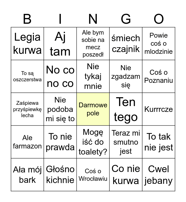 This bingo card has a free space and 31 words: Coś o Wrocławiu, Ale głupoty gadacie, Nie podoba mi się to, Kurwa, Legia kurwa, Ale bym sobie na mecz poszedł, No co no co, Teraz mi smutno jest, Ten tego, Co nie kurwa, Kurrrcze, Cwel jebany, Ale bym w kąkuter poklikał, Co jest byczq, Coś o Poznaniu, Lech to najlepszy klub, To tak nie jest, To nie prawda, Ale farmazon, Mogę iść do toalety?, Powie coś o mlodzinie, Czemó, Ała mój bark, Aj tam, Nie zgadzam się, To są oszczerstwa, śmiech czajnik, Zaśpiewa przyśpiewkę lecha, Głośno kichnie, Nie tykaj mnie and Podrzuci symboliczne rękoma jak się wkurwi.
