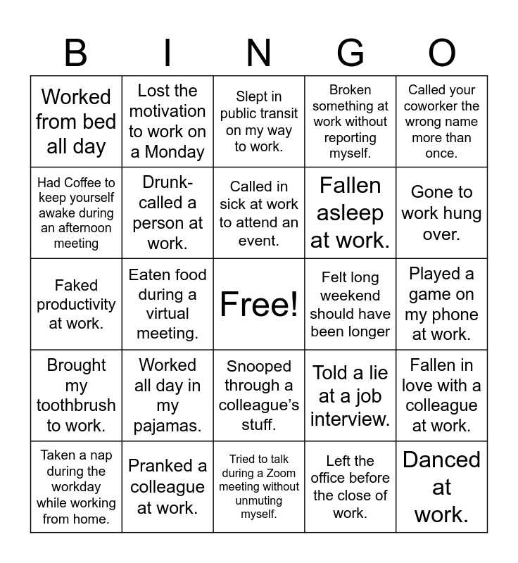 This bingo card has a free space and 25 words: Worked all day in my pajamas., Tried to talk during a Zoom meeting without unmuting myself., Called in sick at work to attend an event., Taken a nap during the workday while working from home., Called your coworker the wrong name more than once., Worked from bed all day, Had Coffee to keep yourself awake during an afternoon meeting, Lost the motivation to work on a Monday, Felt long weekend should have been longer, Snooped through a colleague’s stuff., Fallen asleep at work., Faked productivity at work., Told a lie at a job interview., Fallen in love with a colleague at work., Drunk-called a person at work., Started drinking before the end of the workday., Played a game on my phone at work., Slept in public transit on my way to work., Gone to work hung over., Eaten food during a virtual meeting., Danced at work., Pranked a colleague at work., Brought my toothbrush to work., Broken something at work without reporting myself. and Left the office before the close of work..