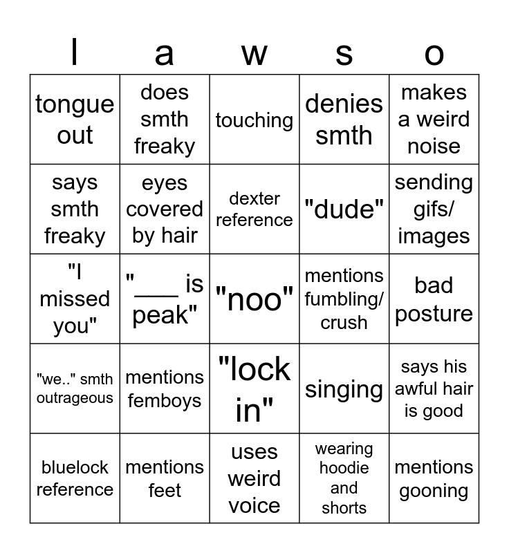 This bingo card has a free space and 24 words: mentions femboys, mentions feet, dexter reference, bluelock reference, makes a weird noise, tongue out, says smth freaky, does smth freaky, mentions fumbling/ crush, "lock in", "dude", "I missed you", singing, says his awful hair is good, eyes covered by hair, wearing hoodie and shorts, bad posture, touching, sending gifs/ images, "___ is peak", mentions gooning, "we.." smth outrageous, denies smth and uses weird voice.