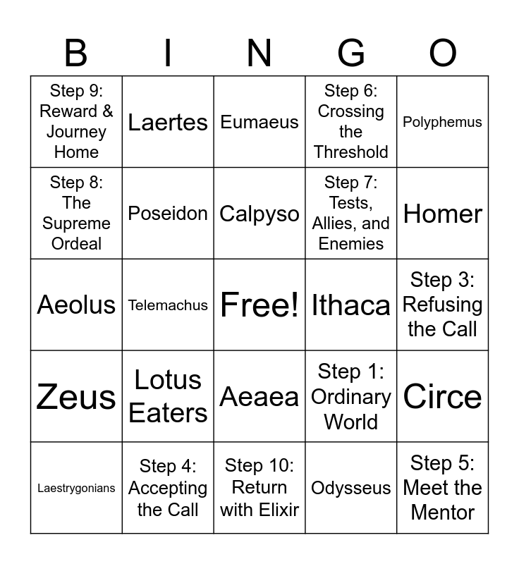 This bingo card has a free space and 32 words: Odysseus, Penelope, Telemachus, Athena, Zeus, Poseidon, Polyphemus, Circe, Laertes, Teiresias, Calpyso, Eumaeus, The Sirens, Scylla & Charybdis, Ithaca, Thrinacia, Laestrygonians, Aeolus, Aeaea, Lotus Eaters, Step 1: Ordinary World, Step 2: Call to Adventure, Step 3: Refusing the Call, Step 4: Accepting the Call, Step 5: Meet the Mentor, Step 6: Crossing the Threshold, Step 7: Tests, Allies, and Enemies, Step 8: The Supreme Ordeal, Step 9: Reward & Journey Home, Step 10: Return with Elixir, Epic and Homer.