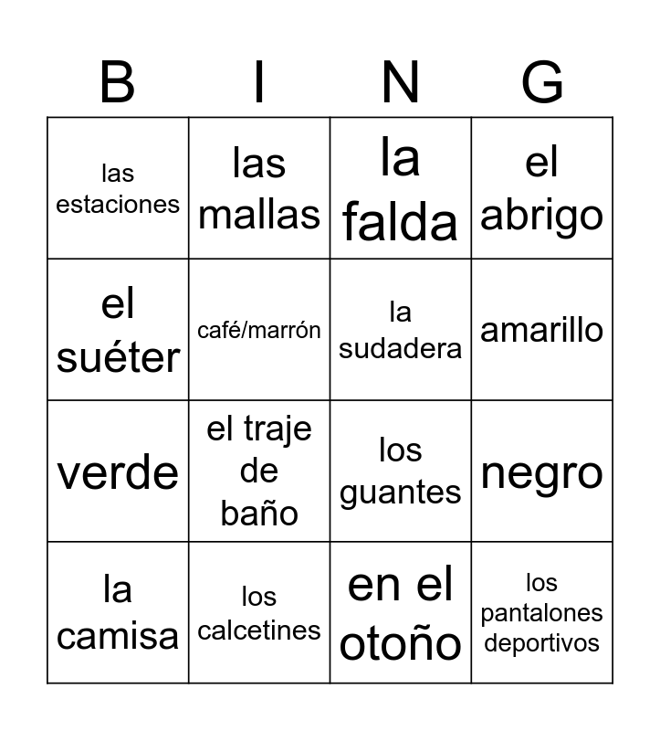This bingo card has 45 words: La ropa, la camisa, la camiseta, la blusa, los pantalones, los pantalones cortos, la falda, el vestido, el suéter, la chaqueta, el abrigo, los calcetines, los zapatos, las botas, la pijama, la gorra, el gorro, los guantes, la bufanda, el traje de baño, las mallas, el traje, las chanclas, las estaciones, en el verano, en el otoño, llevar puesto, ¿Qué ropa llevas puesta hoy?, la corbata, los pantalones deportivos, los lentes, las sandalias, rojo, rosado, gris, negro, blanco, azul, morado, amarillo, café/marrón, verde, anaranjado, la sudadera and los tenis.