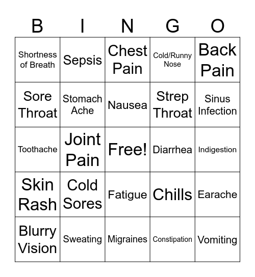 This bingo card has a free space and 35 words: Headache, Fever, Cough, Stomach Ache, Fatigue, Cold/Runny Nose, Sore Throat, Muscle Pain, Nausea, Dizziness, Toothache, Back Pain, Insomnia (Trouble Sleeping), Allergies, Shortness of Breath, Diarrhea, Constipation, Joint Pain, Skin Rash, Vomiting, Chills, Blurry Vision, Earache, Sweating, Chest Pain, Sinus Infection, Anxiety, High Blood Pressure, Strep Throat, Indigestion, Heartburn, Migraines, Cold Sores, Sepsis and Hypertension.