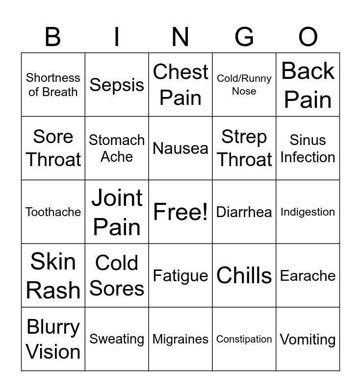 This bingo card has a free space and 35 words: Headache, Fever, Cough, Stomach Ache, Fatigue, Cold/Runny Nose, Sore Throat, Muscle Pain, Nausea, Dizziness, Toothache, Back Pain, Insomnia (Trouble Sleeping), Allergies, Shortness of Breath, Diarrhea, Constipation, Joint Pain, Skin Rash, Vomiting, Chills, Blurry Vision, Earache, Sweating, Chest Pain, Sinus Infection, Anxiety, High Blood Pressure, Strep Throat, Indigestion, Heartburn, Migraines, Cold Sores, Sepsis and Hypertension.