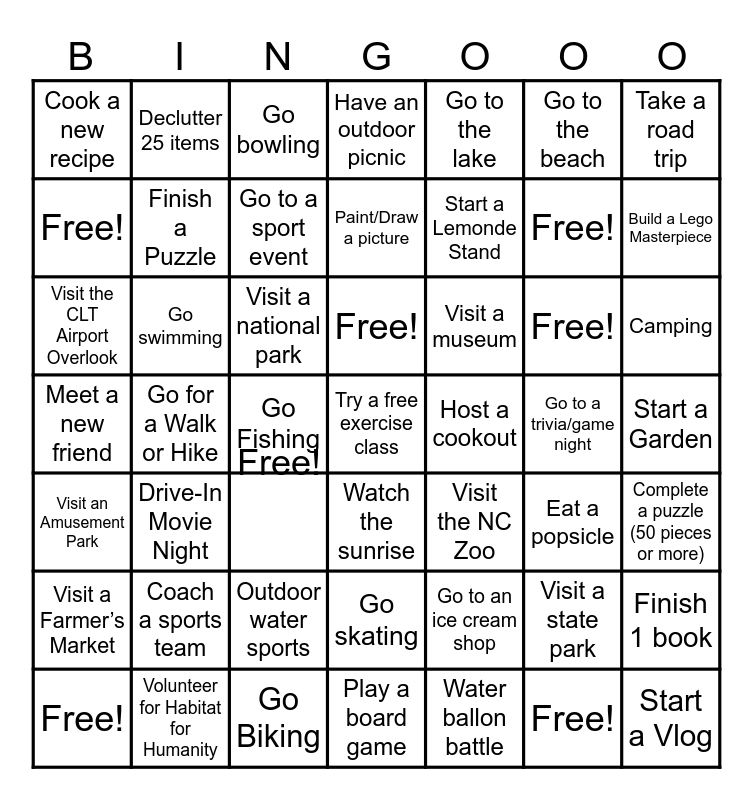 This bingo card has 49 words: Visit a state park, Free!, Water ballon battle, Go for a Walk or Hike, Visit a national park, Start a Garden, Declutter 25 items, Go Biking, Go to the beach, Watch the sunrise, Take a road trip, Have an outdoor picnic, Free!, Visit a museum, Coach a sports team, Go to a trivia/game night, Free!, Build a Lego Masterpiece, Finish 1 book, Go to the lake, Start a Lemonde Stand, Go Fishing, Cook a new recipe, Finish a Puzzle, Free!, Go to a sport event, Camping, Volunteer for Habitat for Humanity, Free!, Go swimming, Start a Vlog, Host a cookout, Visit a Farmer’s Market, Outdoor water sports, Meet a new friend, Visit the NC Zoo, Eat a popsicle, Complete a puzzle (50 pieces or more), Visit the CLT Airport Overlook, Free!, Go skating, Visit an Amusement Park, Try a free exercise class, Play a board game, Paint/Draw a picture, Go bowling, Go to an ice cream shop, Drive-In Movie Night and Free!.