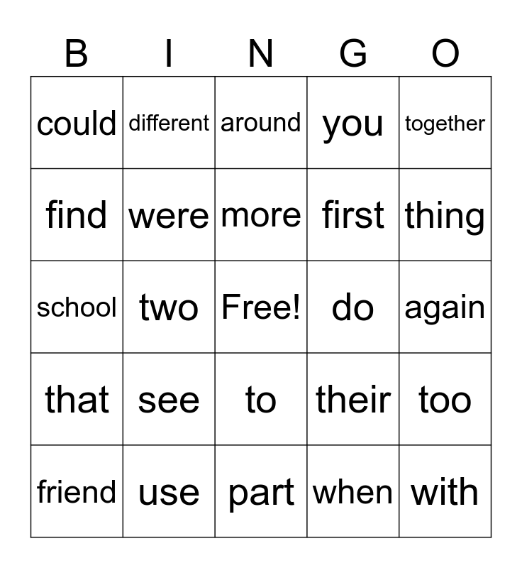 This bingo card has a free space and 24 words: see, use, more, friend, together, could, find, different, do, to, first, school, their, too, were, when, again, around, thing, two, with, that, you and part.