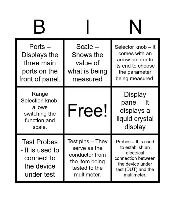 This bingo card has a free space and 8 words: Range Selection knob- allows switching the function and scale., Scale – Shows the value of what is being measured, Display panel – It displays a liquid crystal display, Test Probes - It is used to connect to the device under test, Selector knob – It comes with an arrow pointer to its end to choose the parameter being measured., Ports – Displays the three main ports on the front of panel., Test pins – They serve as the conductor from the item being tested to the multimeter. and Probes – It is used to establish an electrical connection between the device under test (DUT) and the multimeter..