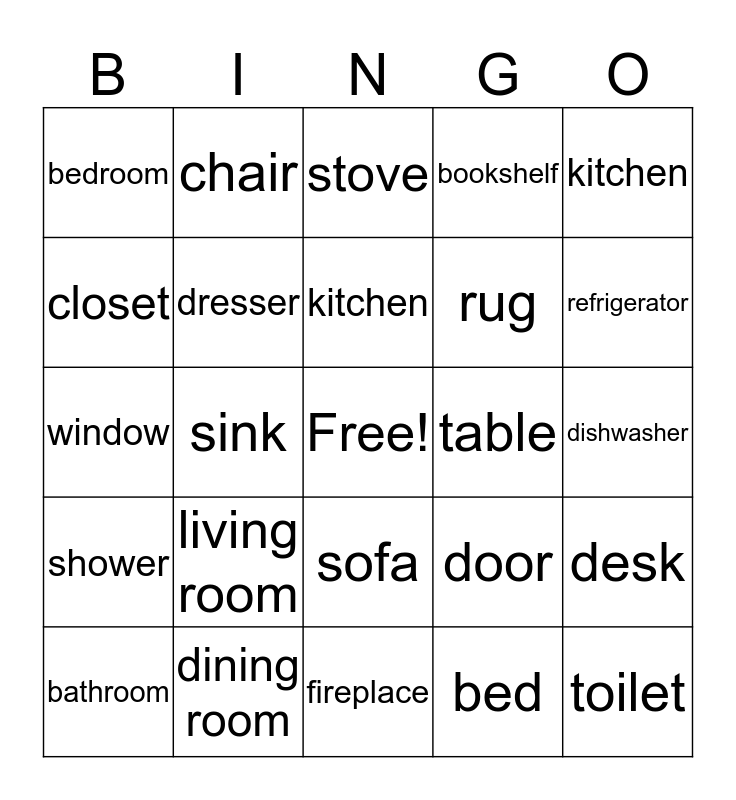 This bingo card has a free space and 24 words: living room, dining room, kitchen, bathroom, kitchen, bedroom, closet, chair, table, sofa, rug, window, door, desk, dresser, bed, dishwasher, stove, refrigerator, sink, toilet, shower, bookshelf and fireplace.