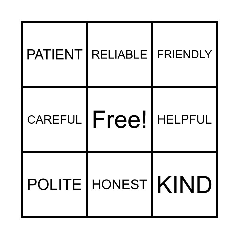 This bingo card has a free space and 8 words: HELPFUL, FRIENDLY, RELIABLE, POLITE, PATIENT, KIND, CAREFUL and HONEST.