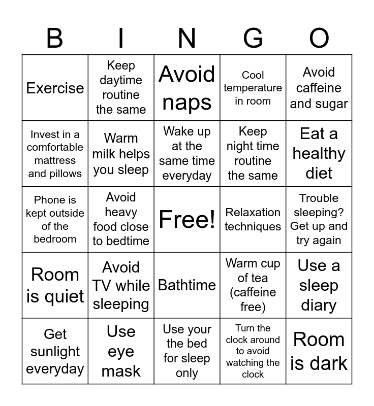 This bingo card has a free space and 26 words: Meditate, Avoid TV while sleeping, Use your the bed for sleep only, Turn the clock around to avoid watching the clock, Eat a healthy diet, Exercise, Keep daytime routine the same, Avoid naps, Keep night time routine the same, Use a sleep diary, Phone is kept outside of the bedroom, Avoid heavy food close to bedtime, Warm cup of tea (caffeine free), Room is dark, Room is quiet, Read a book, Wake up at the same time everyday, Relaxation techniques, Avoid caffeine and sugar, Get sunlight everyday, Warm milk helps you sleep, Bathtime, Cool temperature in room, Trouble sleeping? Get up and try again, Invest in a comfortable mattress and pillows and Use eye mask.