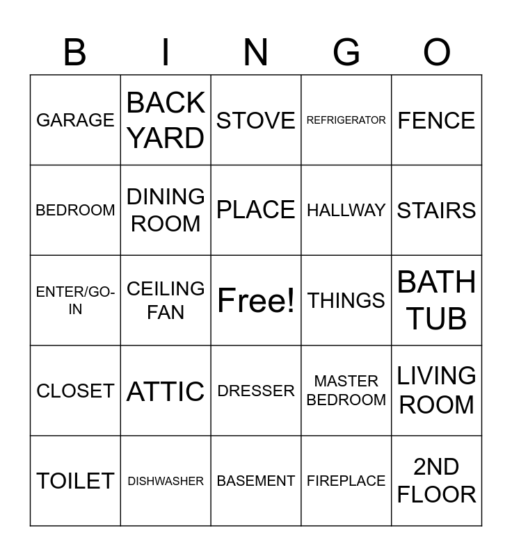 This bingo card has a free space and 52 words: 1ST FLOOR, 2ND FLOOR, 3RD FLOOR, BASEMENT, ATTIC, FRONT YARD, BACK YARD, ROOM, BEDROOM, KITCHEN, DINING ROOM, LAUNDRY ROOM, LIVING ROOM, MASTER BEDROOM, UPSTAIRS, DOWNSTAIRS, PLACE, THINGS, PATIO, FENCE, CEILING FAN, FIREPLACE, GARAGE, HALLWAY, POOL, PORCH, ROOF, ROAD, STAIRS, WINDOWS, ISLAND, REFRIGERATOR, CABINET, COUNTERTOP, MICROWAVE, STOVE, DISHWASHER, SINK, COFFEE MAKER, OVEN, MORE, BATH TUB, CLOSET, RUG, DRESSER, DESK, BED, ENTER/GO-IN, PILLOW, SHOWER, TOILET and WALL.