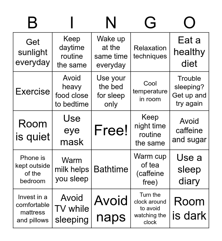 This bingo card has a free space and 27 words: Meditate, Avoid TV while sleeping, Use your the bed for sleep only, Turn the clock around to avoid watching the clock, Eat a healthy diet, Exercise, Keep daytime routine the same, Avoid naps, Keep night time routine the same, Use a sleep diary, Phone is kept outside of the bedroom, Avoid heavy food close to bedtime, Warm cup of tea (caffeine free), Room is dark, Room is quiet, Read a book, Wake up at the same time everyday, Relaxation techniques, Avoid caffeine and sugar, Get sunlight everyday, Warm milk helps you sleep, Bathtime, Cool temperature in room, Trouble sleeping? Get up and try again, Invest in a comfortable mattress and pillows, Use eye mask and Limit alcohol before bedtime.