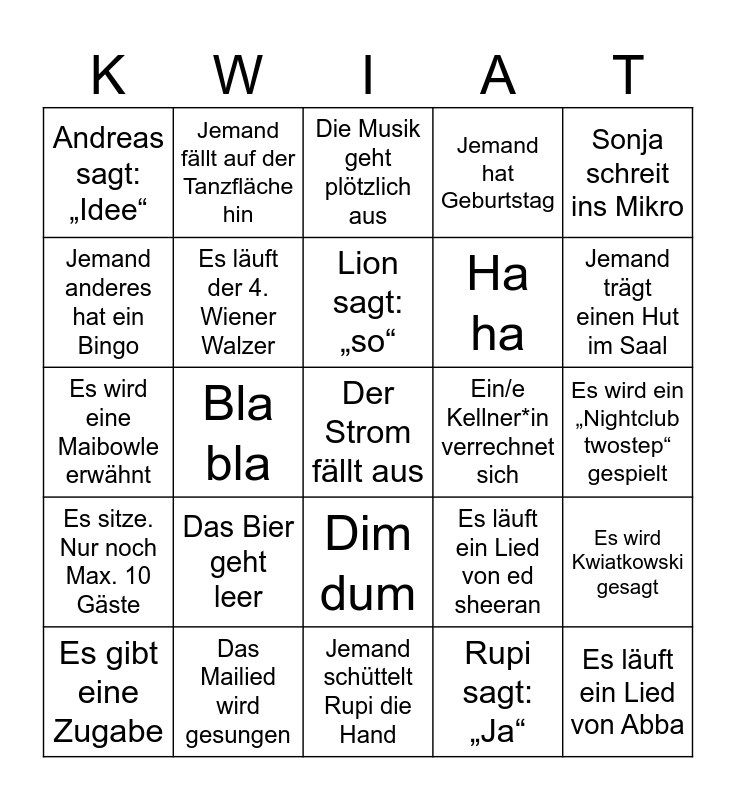 This bingo card has a free space and 24 words: Es gibt eine Zugabe, Das Bier geht leer, Lion sagt: „so“, Rupi sagt: „Ja“, Sonja schreit ins Mikro, Andreas sagt: „Idee“, Jemand fällt auf der Tanzfläche hin, Die Musik geht plötzlich aus, Ein/e Kellner*in verrechnet sich, Es wird ein „Nightclub twostep“ gespielt, Es wird eine Maibowle erwähnt, Es läuft der 4. Wiener Walzer, Es läuft ein Lied von ed sheeran, Es wird Kwiatkowski gesagt, Jemand anderes hat ein Bingo, Das Mailied wird gesungen, Jemand schüttelt Rupi die Hand, Jemand hat Geburtstag, Jemand trägt einen Hut im Saal, Es sitze. Nur noch Max. 10 Gäste, Bla bla, Dim dum, Ha ha and Es läuft ein Lied von Abba.