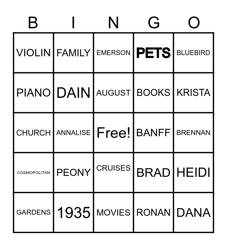 This bingo card has a free space and 24 words: PEONY, 1935, AUGUST, GARDENS, BLUEBIRD, VIOLIN, PIANO, FAMILY, BANFF, CRUISES, BOOKS, CHURCH, BRAD, HEIDI, DAIN, RONAN, BRENNAN, EMERSON, KRISTA, ANNALISE, DANA, COSMOPOLITAN, PETS and MOVIES.