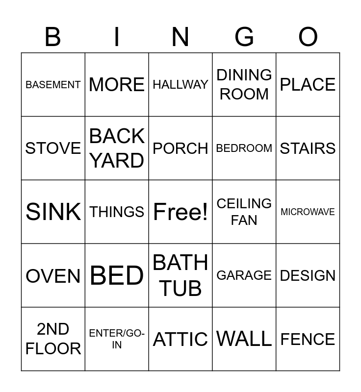This bingo card has a free space and 57 words: 1ST FLOOR, 2ND FLOOR, 3RD FLOOR, BASEMENT, ATTIC, FRONT YARD, BACK YARD, ROOM, BEDROOM, KITCHEN, DINING ROOM, LAUNDRY ROOM, LIVING ROOM, MASTER BEDROOM, UPSTAIRS, DOWNSTAIRS, PLACE, THINGS, PATIO, FENCE, CEILING FAN, FIREPLACE, GARAGE, HALLWAY, POOL, PORCH, ROOF, ROAD, STAIRS, WINDOWS, ISLAND, REFRIGERATOR, CABINET, COUNTERTOP, MICROWAVE, STOVE, DISHWASHER, SINK, COFFEE MAKER, OVEN, MORE, BATH TUB, CLOSET, RUG, DRESSER, DESK, BED, ENTER/GO-IN, PILLOW, SHOWER, TOILET, WALL, GUEST ROOM, DRESSER, STARS, DESIGN and IMPROVE.