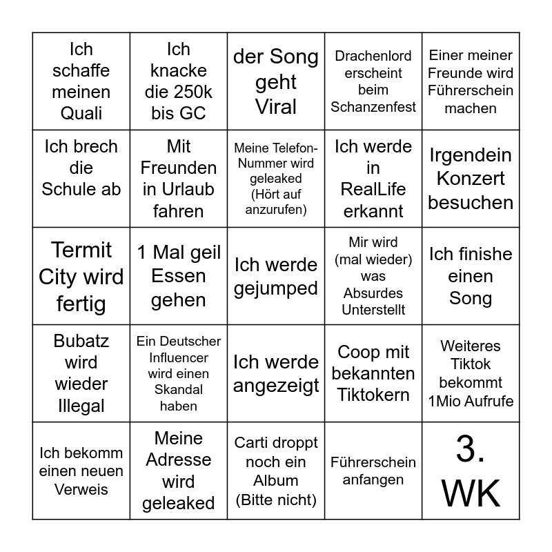 This bingo card has a free space and 24 words: Ein Deutscher Influencer wird einen Skandal haben, Meine Adresse wird geleaked, Meine Telefon-Nummer wird geleaked (Hört auf anzurufen), Ich bekomm einen neuen Verweis, Einer meiner Freunde wird Führerschein machen, Ich schaffe meinen Quali, Ich brech die Schule ab, Ich knacke die 250k bis GC, Mir wird (mal wieder) was Absurdes Unterstellt, Ich werde angezeigt, Ich werde in RealLife erkannt, Termit City wird fertig, Coop mit bekannten Tiktokern, Weiteres Tiktok bekommt 1Mio Aufrufe, Mit Freunden in Urlaub fahren, Führerschein anfangen, Ich finishe einen Song, der Song geht Viral, Irgendein Konzert besuchen, 1 Mal geil Essen gehen, 3. WK, Bubatz wird wieder Illegal, Drachenlord erscheint beim Schanzenfest and Carti droppt noch ein Album (Bitte nicht).