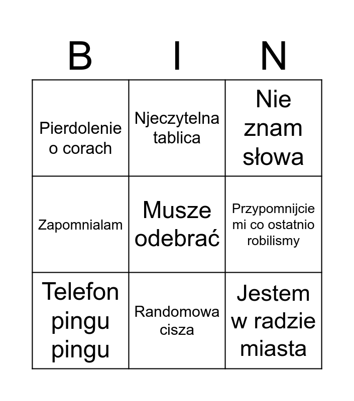 This bingo card has a free space and 10 words: Randomowa cisza, Nie znam słowa, Pierdolenie o corach, Jestem w radzie miasta, Zapomnialam, Telefon pingu pingu, Njeczytelna tablica, Wyslemy zdjecie na grupke, Przypomnijcie mi co ostatnio robilismy and Musze odebrać.