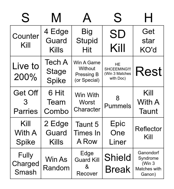 This bingo card has 35 words: Kill At 50% Or Below, Win Sudden Death, Kill With Warloc/Falcon Punch, Tech A Stage Spike, Taunt 5 Times In A Row, SD Kill, Live to 200%, Ledge to Ledge Untouched, Win A Game Without Pressing B (or Special), 3 Stock Win, Get Off 3 Parries, Get star KO'd, SD, Double Kill, Counter Kill, 8 Pummels, Shield Break, 6 Hit Team Combo, Kill With A Spike, Win With Worst Character, Epic One Liner, Fully Charged Smash, Reflector Kill, Win As Random, Big Stupid Hit, Rest, Ganondorf Syndrome (Win 3 Matches with Ganon), Win Without Taking Damage, HE SHCEEMING!!! (Win 3 Matches with Doc), Kill With A Taunt, Edge Guard Kill, Edge Guard Kill & Recover, 2 Edge Guard Kills, 4 Edge Guard Kills and Final Kill With Edge Guard.
