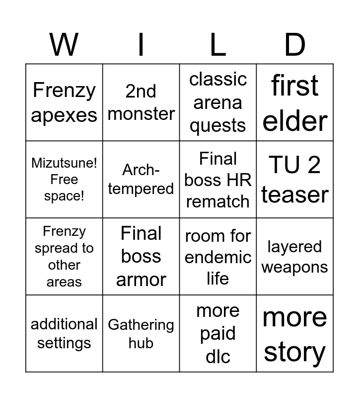 This bingo card has 16 words: Gathering hub, layered weapons, classic arena quests, Frenzy apexes, Frenzy spread to other areas, 2nd monster, room for endemic life, more paid dlc, Mizutsune! Free space!, Arch-tempered, additional settings, first elder, Final boss armor, TU 2 teaser, Final boss HR rematch and more story.